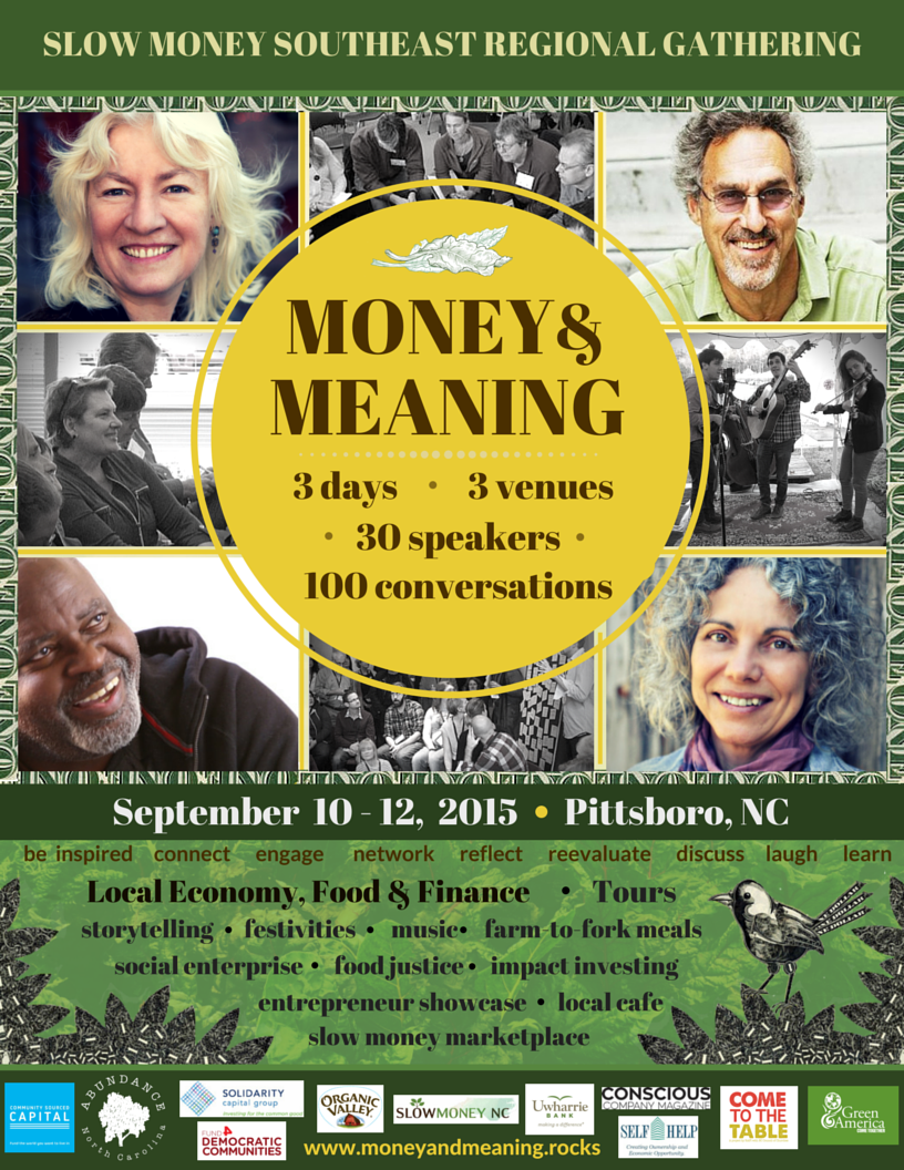 I attended the first ever Slow Money Regional Gathering, Money and Meaning. The Abundance Foundation and Slow Money NC, one of the two largest Slow Money networks, hosted the conference at three locations in and around Pittsboro, NC on September 10-12.