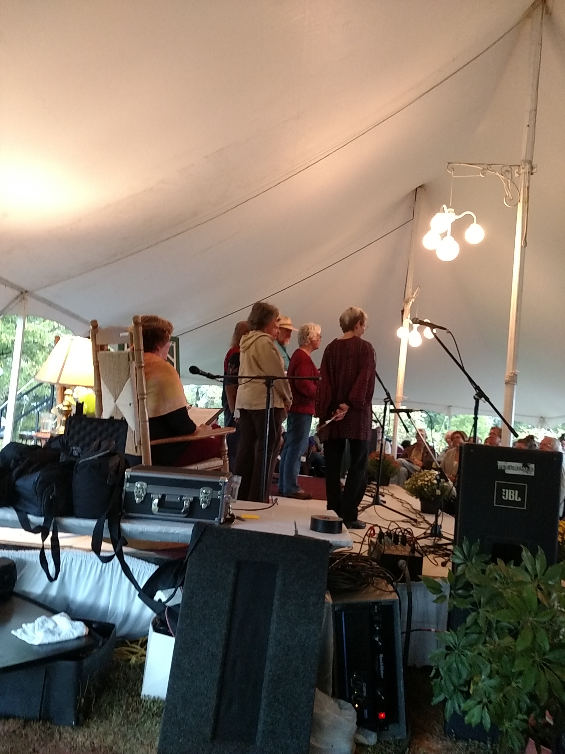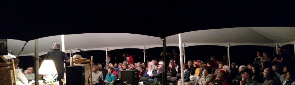 Sated, especially on remarkable macaroni and cheese and peach cobbler, we made our way further up the hill to where a large tent covered chairs and a stage in front of Highlander co-Founder Miles Horton’s house. Perhaps 150 of us signed the guest book, greeted old friends, and chose seats. Highlander Executive Director Pam McMichael and Mary Thom Adams read commentary covering Guy’s long and extraordinary life. The evening